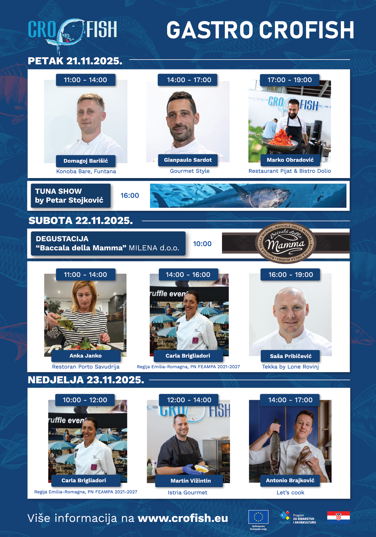 Svoje vještine prezentirati će vrhunski kuhari iz renomiranih istarskih restorana, ali i poznate ličnosti sa TV ekrana. Biti će tu raznovrsnih specijaliteta od brancina, tune, kozica, Jakobovih kapica, orade, trilje, kokota, dagnji, lignji, sipa, te mnogih drugih slasnih ribljih jela.